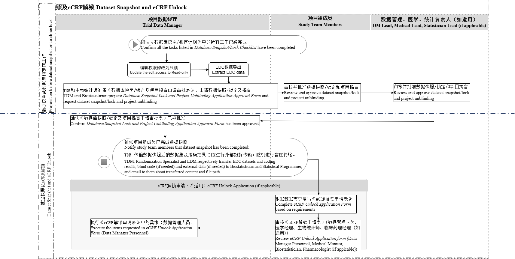 Level 1的数据库快照或锁定:TDM和生物统计师共同准备《DM-FM-014_数据库快照锁定及项目揭盲申请审批表模板》(见工作模板),TDM负责填写数据快照/锁定的内容及完成情况,生物统计师负责揭盲模块的填写。