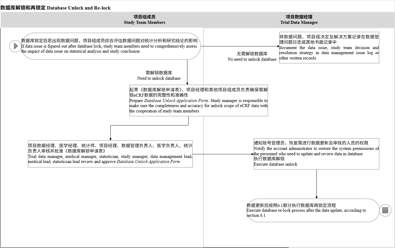 - 如果EDC锁库后发生与安全性或有效性参数有关的数据问题,且有可能影响到统计分析和研究结论时,一定要经过项目组讨论审批后,认为必须要解锁,方可开始执行解锁操作。若无需解锁数据库,项目数据经理将数据问题,项目组决定解决在数据管理问题记录中(参考工具文件SOP-CDSC-007F2)。