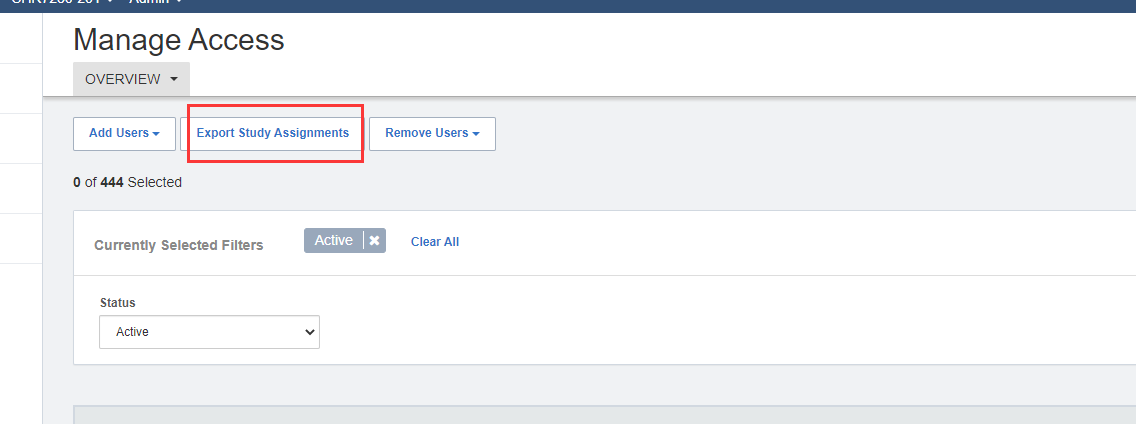 - 具有生产环境Cloud Admin 权限的数据管理人员在Manage Access模块中点击Export Study Assignment下载项目User List。